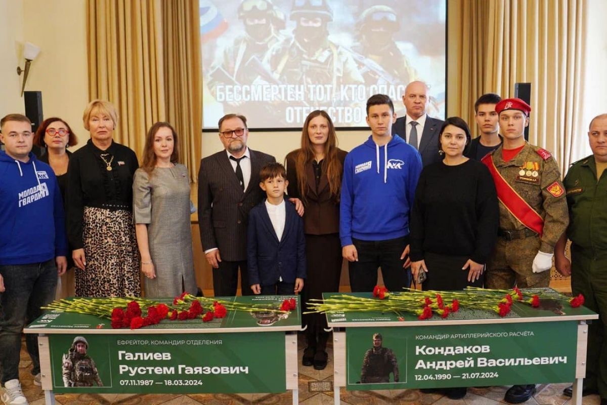 Активисты Татарстанского реготделения «Молодая Гвардия» при поддержке партии «Единая Россия» совместно с Комитетом по делам детей и молодежи Казани открыли в гимназии №3 парты Героев в память о погибших участниках специальной военной операции — командира артиллерийского расчета Андрея Кондакова и ефрейтора Рустема Галиева. Образовательный проект «Парта Героя» инициировала партия «Единая Россия» в рамках партпроекта «Новая школа». Проект в доступной форме рассказывает школьникам о земляках, которые совершили доблестный поступок и проявили личное мужество. На каждой парте размещена информация о герое, который имеет непосредственное отношение к школе, его фотография, биография и описание героического пути. Открытие парт Героев в гимназии началось с выноса государственных флагов Российской Федерации и Республики Татарстан. В мероприятии приняли участие заместитель секретаря Татарстанского реготделения партии, заместитель Председателя Комитета по социальной политике Ольга Воронова, депутат Госсовета РТ, руководитель МГЕР Руслан Шигабуддинов, председатель Комитета по делам детей и молодежи Казани Алия Загидуллина, замначальника Академии национальной безопасности РФ Максим Рябцов, директор гимназии №3 Александр Морозов. Среди присутствующих были и семьи погибших бойцов – Елена Галиева и Алсу Кондракова с сыном Римом. Ольга Воронова отметила, что открытие парт Героев, погибших в зоне СВО, — это дань памяти, уважения и признания, которые крайне важны именно сейчас. «Патриотическое воспитание в школах — это практика, которая особенно важна для подрастающего поколения. Дети начинают осознавать, что герои войны — это не абстрактные люди, а те, кто учился в их же школе. Это преемственность поколений, которая помогает им понять и почувствовать связь с историей», — подчеркнула депутат. Выпускник гимназии Андрей Кондраков родился 12 апреля 1990 года в Казани в семье потомственных военных. Его отец был кадровым офицером, ветераном Афганистана, оба деда участвовали в Великой Отечественной войне, а прадеды – в Первой мировой. С ранних лет Андрей впитал ценности патриотизма, верности долгу и любви к Родине. Высшее образование получил в Институте экономики, управления и права. Был женат, воспитывал сына. Службу проходил в составе 55-й отдельной гвардейской мотострелковой бригады (в/ч 55115) на должности командира артиллерийского расчета. Погиб 21 июля 2024 года при выполнении боевого задания, прикрывая отход своей группы. Андрей Кондаков посмертно награжден Орденом Мужества. Вдова Андрея Кондракова – Алсу – обратилась к присутствующим с важным напоминанием о ценности семьи и отношениях с родителями. Она подчеркнула, как важно не забывать о тех, кто всегда рядом и кто любит нас без условий. «Я знаю, что в семье бывают конфликты, и иногда вы обижаетесь на родителей за мелочи. Но прошу вас, не обижайтесь на них. Они вас любят, отдают всю свою жизнь и каждый день стараются для вас. Я, как родитель, понимаю, как это тяжело. Поэтому, когда вернетесь домой, обязательно обнимите своих родителей. Мой сын занимается дзюдо, и когда мы были на могиле, он сказал своему отцу, что у него сдача на белый пояс. А через день он уже показывал его на могиле. Мы часто забываем о самых важных людях в нашей жизни — о родителях», — обратилась она к юным участник